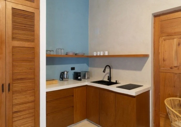 La cocineta de diseño está equipada con todo lo necesario para una estancia sin compromisos: estufa de inducción, frigobar, cafetera Nespresso, tetera eléctrica, máquina para hacer hielo, espumador de leche, tostadora, sartenes, ollas, platos, vasos, copas, sacacorchos y cubiertos. Cada detalle ha sido pensado para que disfrutes de una experiencia práctica y sofisticada.