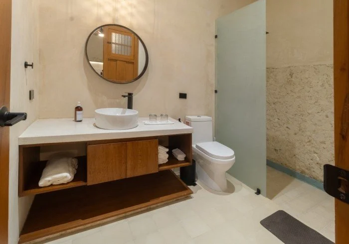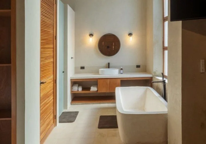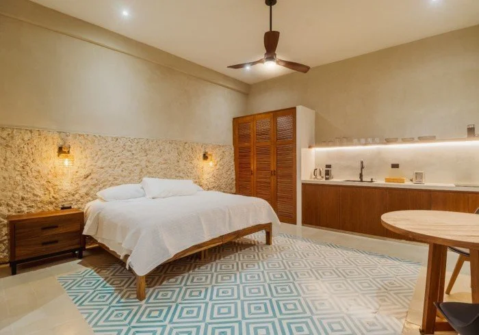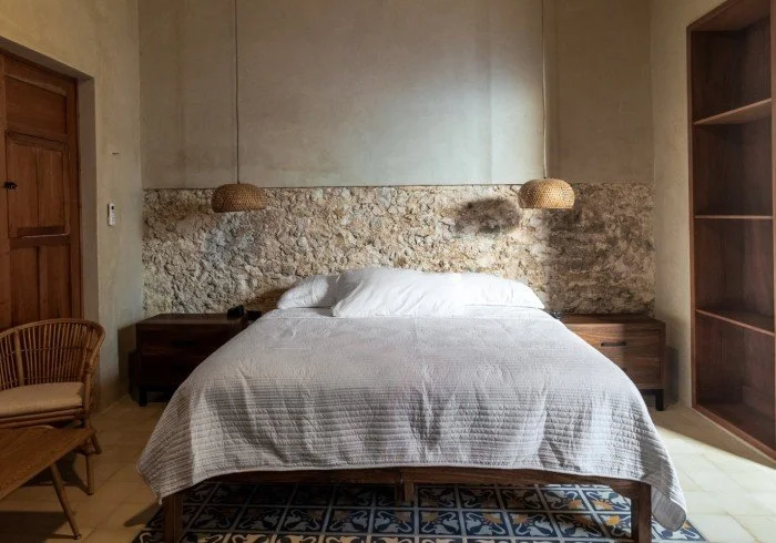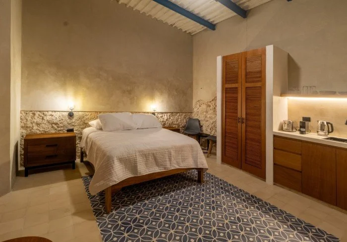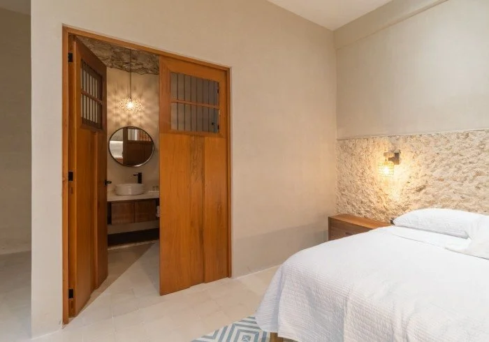 Con su vista doble a la calle y al jardín central, la suite combina privacidad, luz natural y un ambiente acogedor que realza la esencia de Casa Tunkul.
