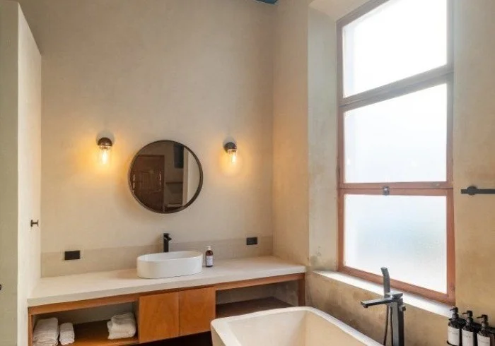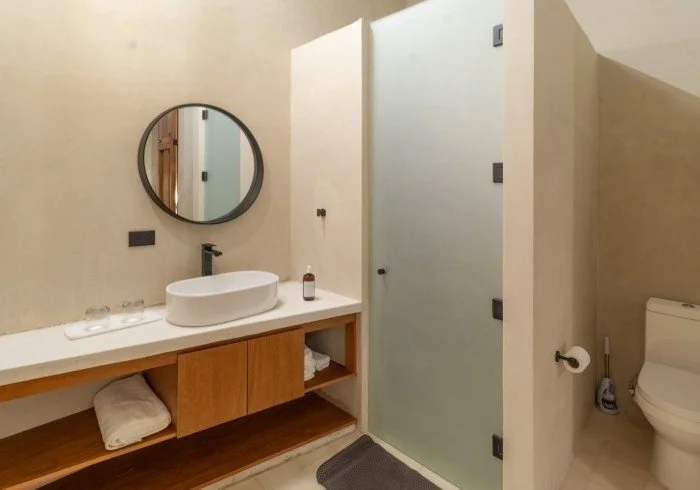 El baño privado ofrece una ducha amplia con luz natural, gracias a un elegante cubo de iluminación cenital que conecta con el cielo y llena el espacio de claridad, creando un ambiente sereno y sofisticado.